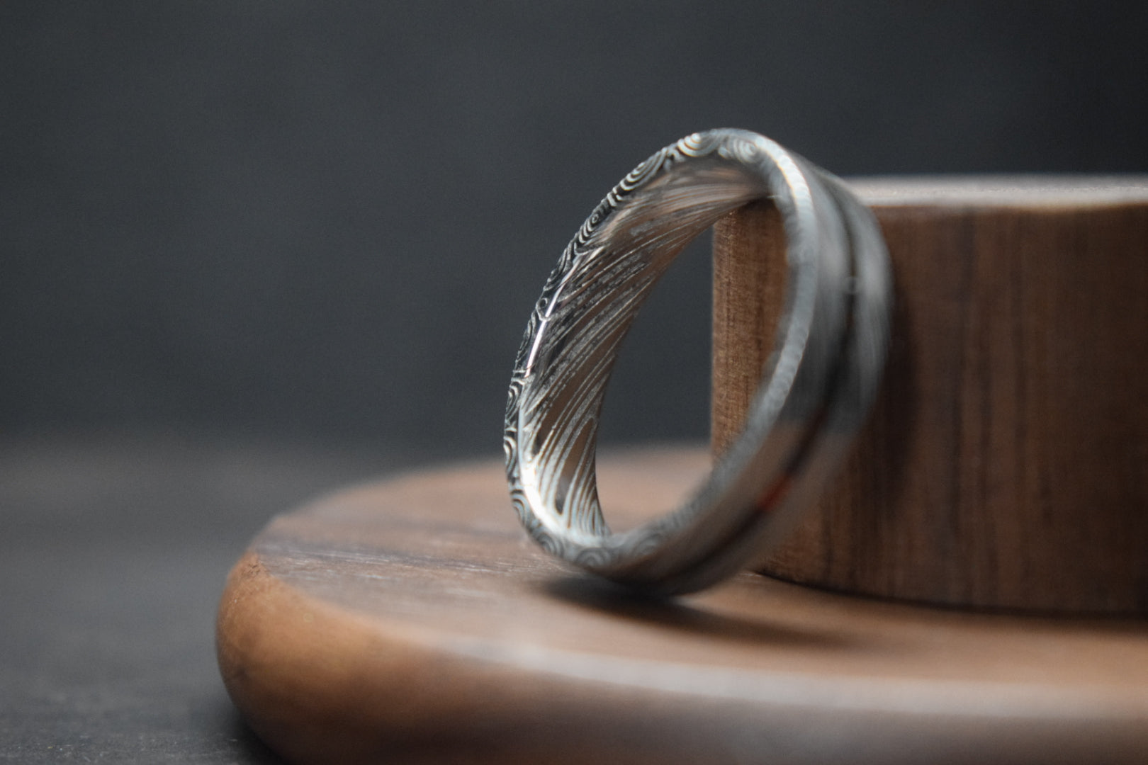Made in Scotland, this Damascus Steel ring features a 1mm inlay channel, ready to be customised in your chosen colour. Whether it matches your partner’s engagement ring, reflects your favourite colour, or nods to your football team, this ring is designed to carry personal meaning in every detail.