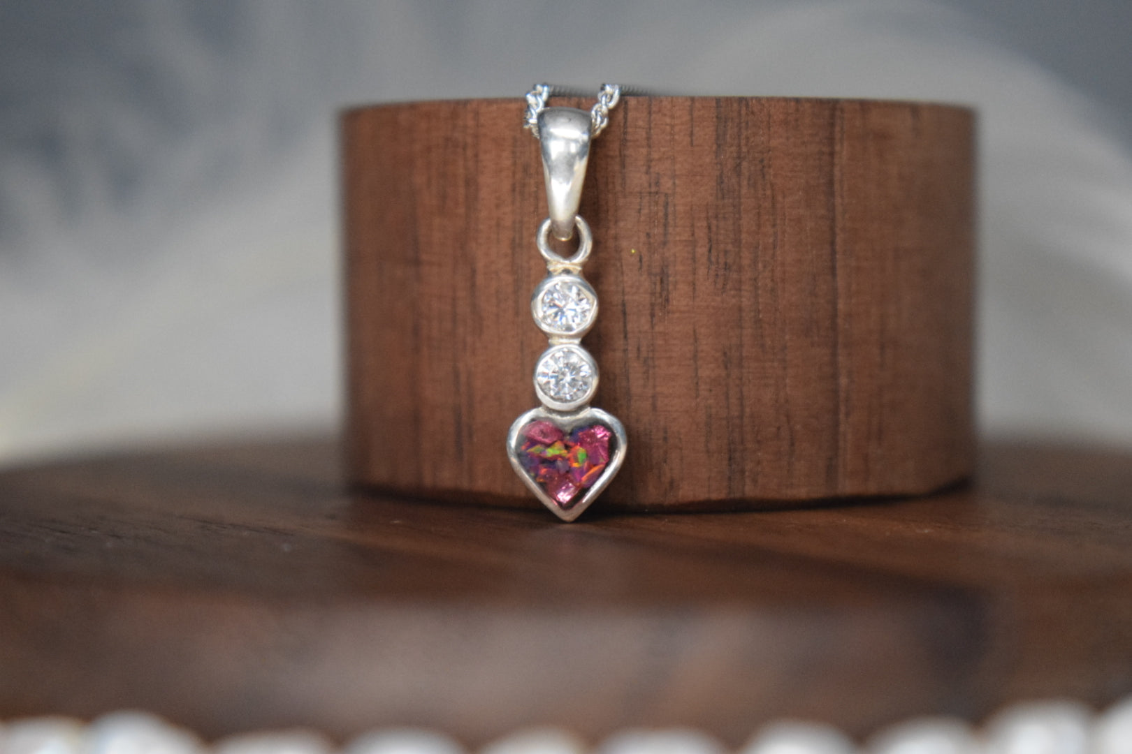 The Heart CZ Silver Memorial Ashes Necklace is a beautifully delicate piece that allows you to keep a part of your loved one close to your heart. This necklace features a small heart-shaped pendant with two cubic zirconia stones, a stylish bale, and a silver 18-inch chain. Customisable to suit your personal style and preferences, it’s a touching way to cherish the memory of a loved one.