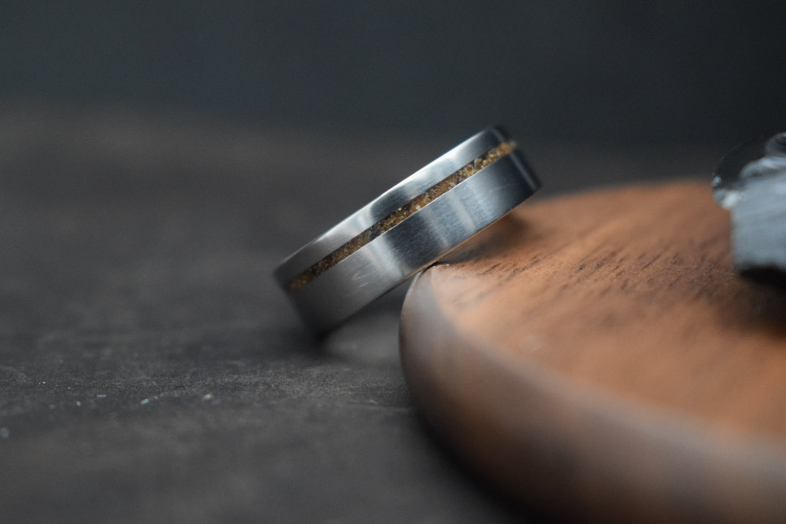 Each inlay is created using carefully prepared oak fragments, placed by hand into a fine 1 mm or  statement 2mm channel and sealed beneath a clear, durable resin. The surface is polished smooth, while the natural grain and tonal variation remain visible beneath, creating depth without losing refinement. If you are looking for a version with gold accents, you can find it here.